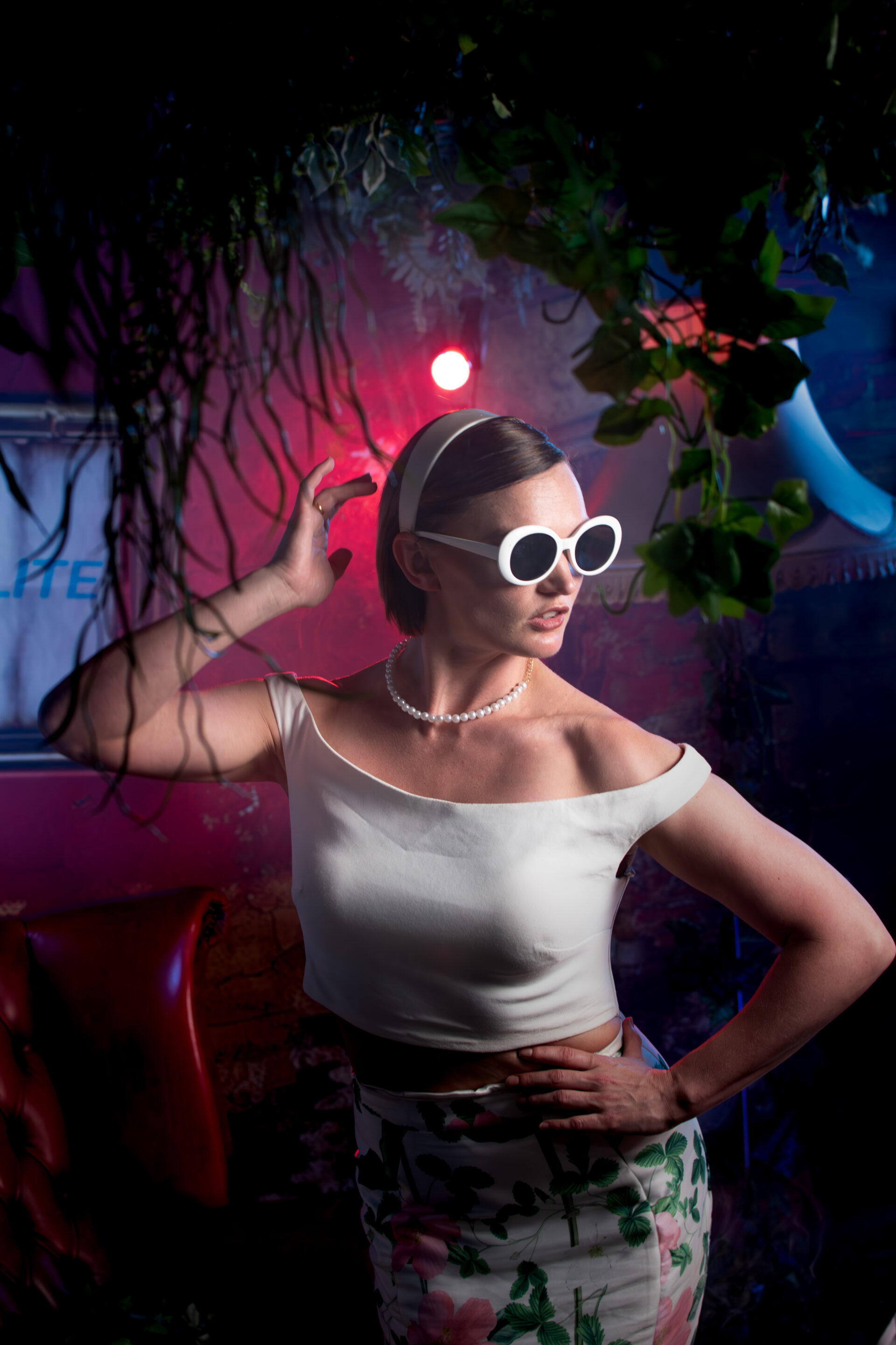 A fashion-inspired portrait using dramatic coloured lighting and styling to create a bold, editorial look.