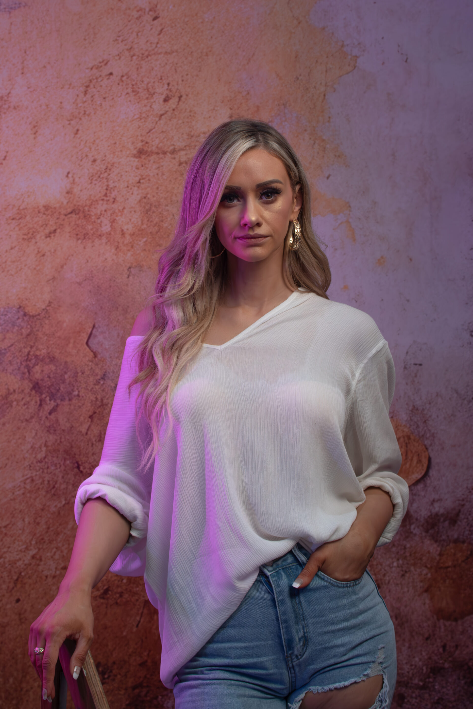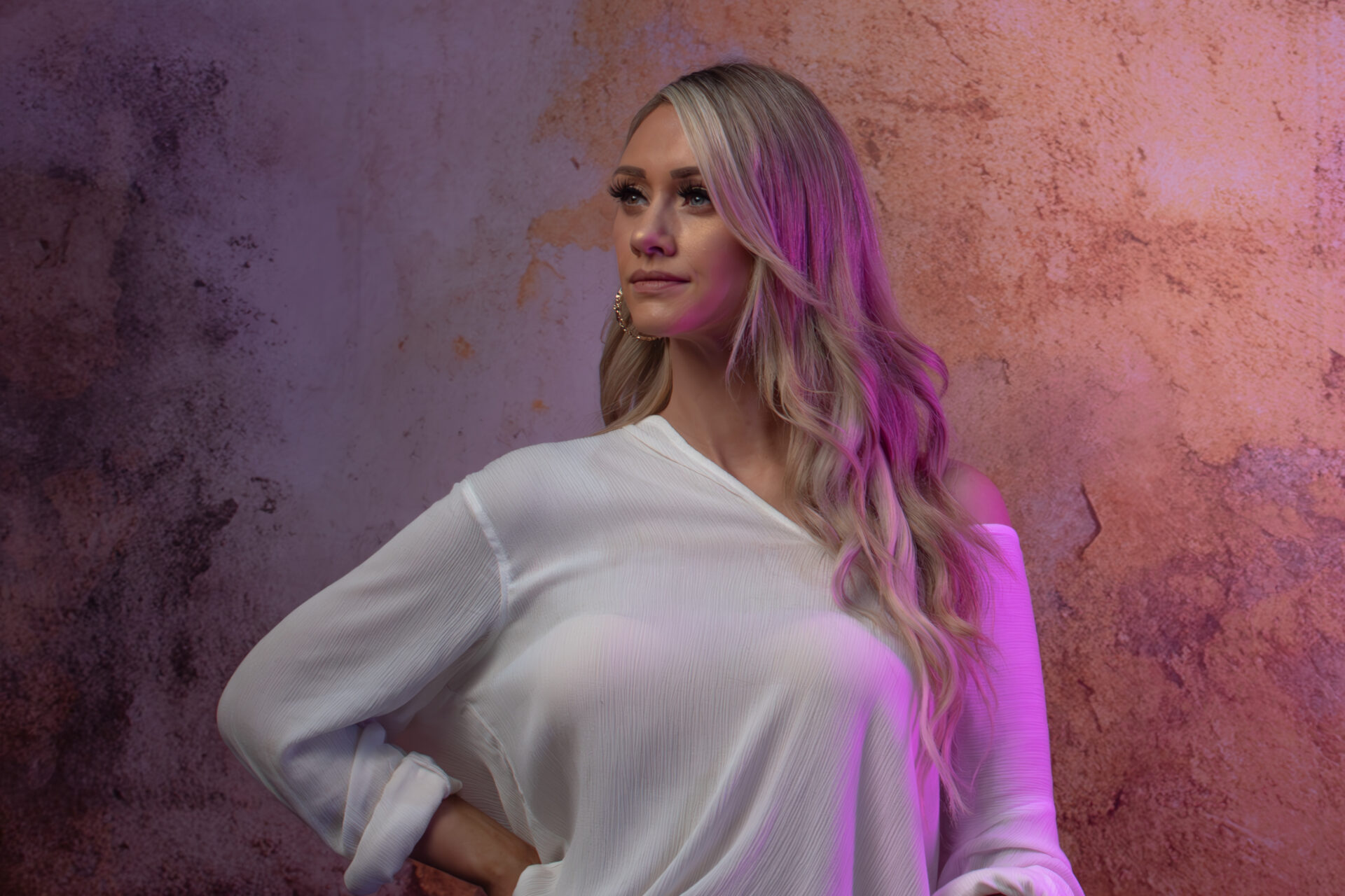 A relaxed portrait capturing a natural pose enhanced by gentle coloured light.